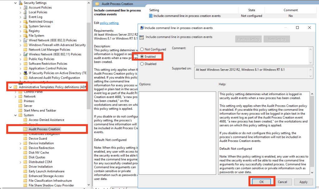 - Administrative Templates > System > Audit Process Creation> Include command line in process creation events “Enabled” haline getirilir.