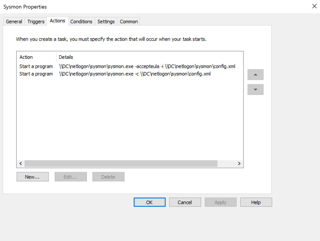 - Actions sekmesinde iki “Start a program” (Sysmon config dosyası SwiftOnSecurity (3) ayarlarına göre oluşturuldu.) aşağıdaki gibi oluşturulur. İlgili network paylaşım yolunu lab. ayarlarınıza göre değiştirebilirsiniz. Sysmon’u bu bağlantıdan indirebilirsiniz.