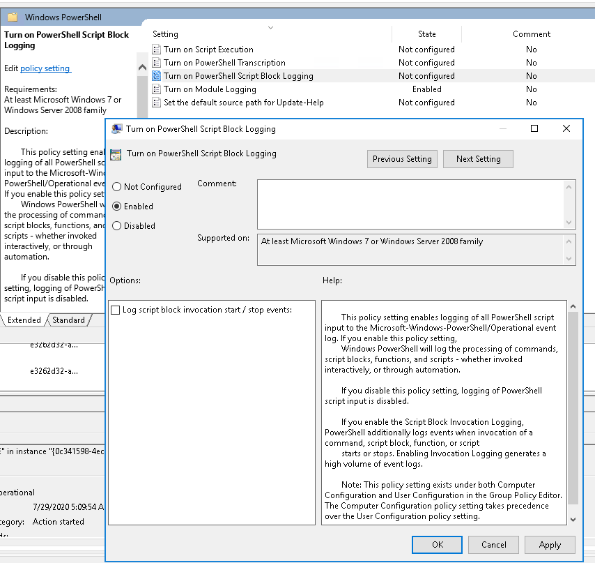 Aşağıdaki üç GP ayarı ile Powershell kullanılarak yazılan komutlar, kullanılan modüller ve bunların çıktılarının loglanması mümkün. Event ID 4103, 4104, 4105 ve 4106 loglarını yazının ikinci bölümünde daha detaylı irdelemeyi planlıyorum.