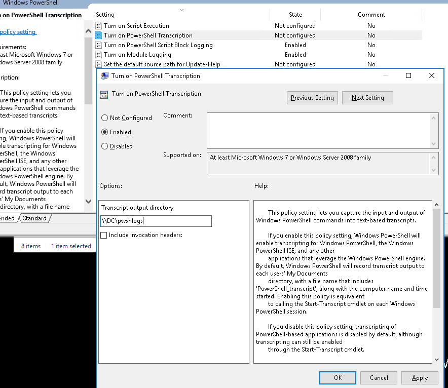 - Son olarak Turn on Powershell Transcription ayarları da aşağıdaki gibi oluşturulur. Output directory’i file share olarak seçmenizde fayda var. Zira her istemci veya sunucudan tek tek transcription loglarını toplamak ve incelemek oldukça zaman alacaktır.