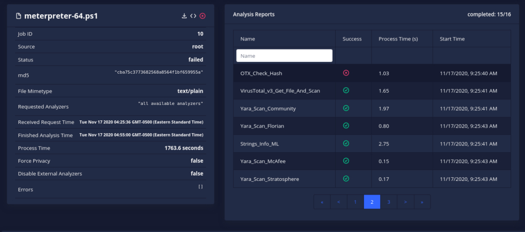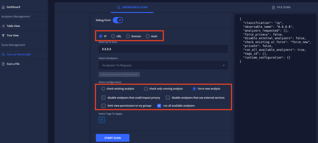 “Observable Scan” bölümünden IP, URL, Domain adı veya Hash bilgilerini sorgulamamız mümkün. “Force new analysis” ile tamamen yeni bir analiz başlatmak ve “run all available analyzers ile de tüm modülleri aktif etmek biraz zaman alsa da daha ayrıntılı sonuçları ekrana yansıtacaktır.