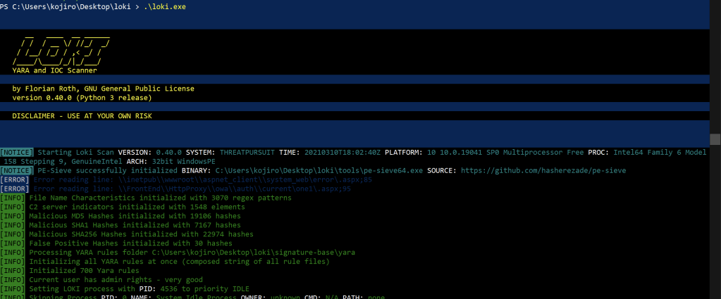 İlgili ayarları yaptıktan sonra geriye loki.exe’yi yönetici haklarıyla çalıştırmak ve rapor sonucunu incelemek kalıyor.