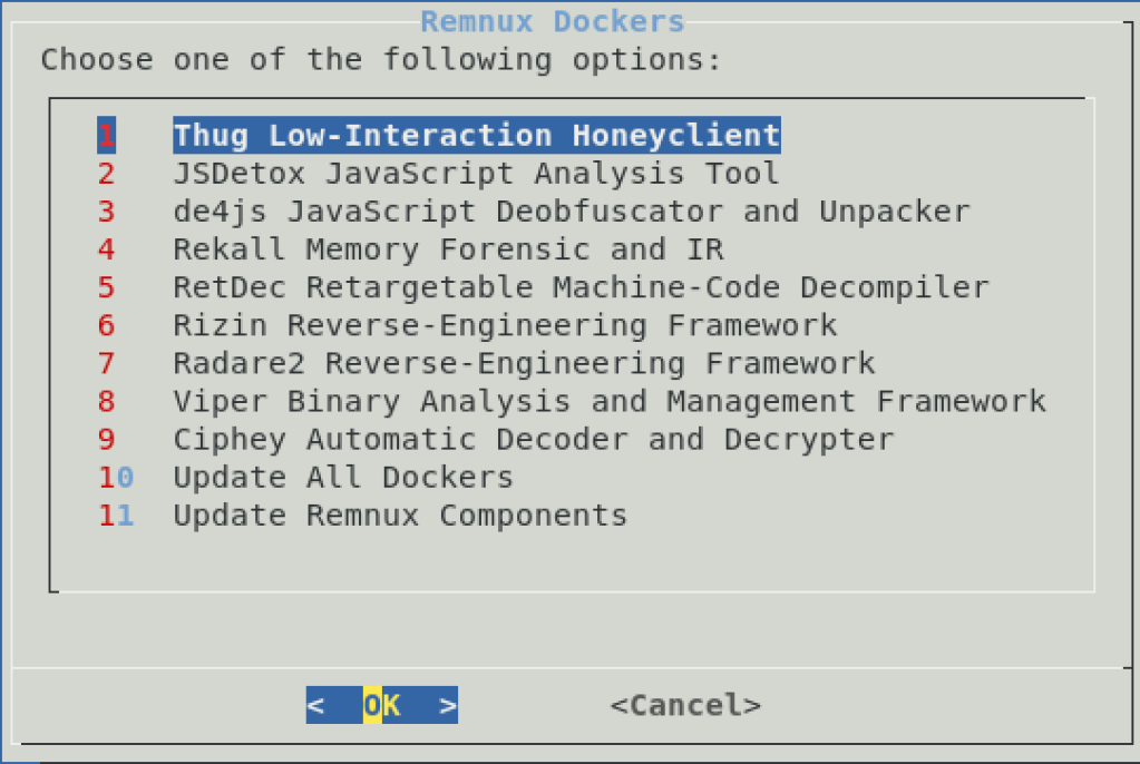 Scripti çalıştırdıktan sonra dilediğiniz aracı seçerek kurulumları gerçekleştirebilir ve sonrasında kullanmaya başlayabilirsiniz. REMnux ile birlikte gelen docker containerlarına dair detaylara da bu bağlantıdan erişebilirsiniz.