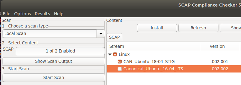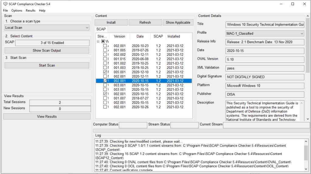 Kurulum işlemleri bittikten sonra SCAP Compliance Checker aracına ait aşağıdaki ekran görüntüsünü inceyelim. Aracın sol bölümü tarama başlatma ve tarama sonuçlarıyla ilgiliyken, orta bölüm hangi araçlarla tarama yapılacağını ve sağ bölümse ilgili taramanın detaylarını içeriyor.