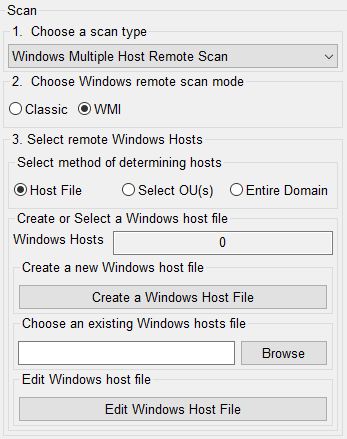“Windows Multiple Host Remote Scan” tarama tipini seçerek Active Directory ortamında yer alan sunucu veya istemcilerle ilgili güvenlik taramaları yapılarak raporların elde edilebilmekte. Ayrıca önceden belirlenen ve kaydedilen Windows istemci / sunucu listesi “Create a Windows Host File” menüsünden girildiğinde belli sunucu ve istemciler taratılabiliyor.