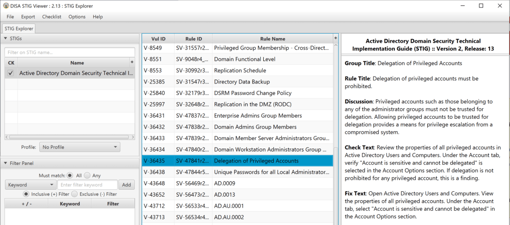 Sonrasında yukarıda ekran görüntüsünde yer alan politikaları indirdikten sonra DISA STIG Viewer aracına anılan politikaları aktarmak ve incelemek mümkün.