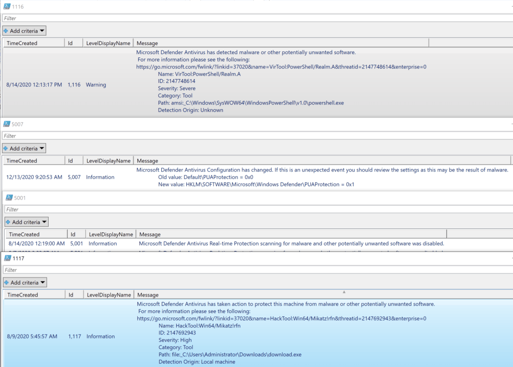 - Event ID: 5007 – Microsoft Defender Antivirus configuration has changed. If this is an unexpected event, you should review the settings as this may be the result of malware.
