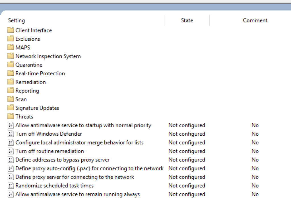 - Computer Configuration > Policies > Administrative Templates > Windows Components > Windows Defender yolunu takip ederek Windows Defender GPO ayarlarını inceleyelim.