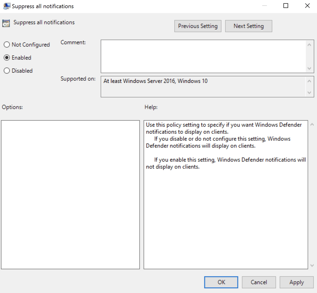 - Computer Configuration > Policies > Administrative Templates > Windows Components > Windows Defender > Client Interface > Suppress all notifications seçeneğini enabled yaparak kullanıcılara bildirim gitmesini engelleyebilir veya disabled yaparak bildirimleri açabilirsiniz.