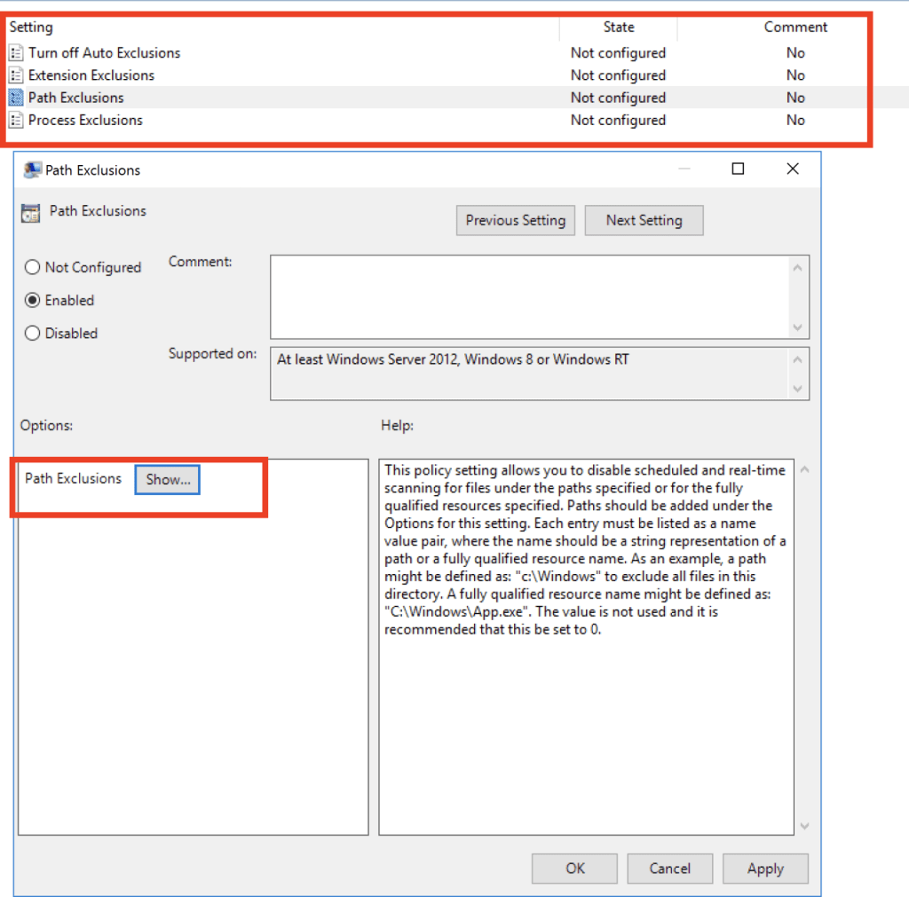 - Computer Configuration > Policies > Administrative Templates > Windows Components > Windows Defender > Exclusions yolunu takip ederek belli process, uzantı, path vs. için istisnalar belirleyebilirsiniz.