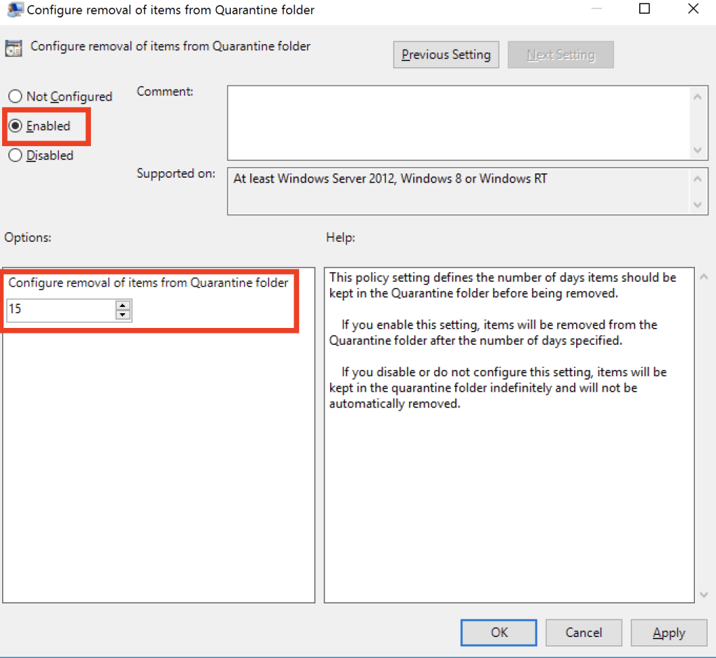 - Computer Configuration > Policies > Administrative Templates > Windows Components > Windows Defender > Quarantine > Configure removel of items form Quarantine folder seçeneğiyle karantinada kalacak dosyaların kaç gün sonra silineceğini belirleyebilirsiniz.