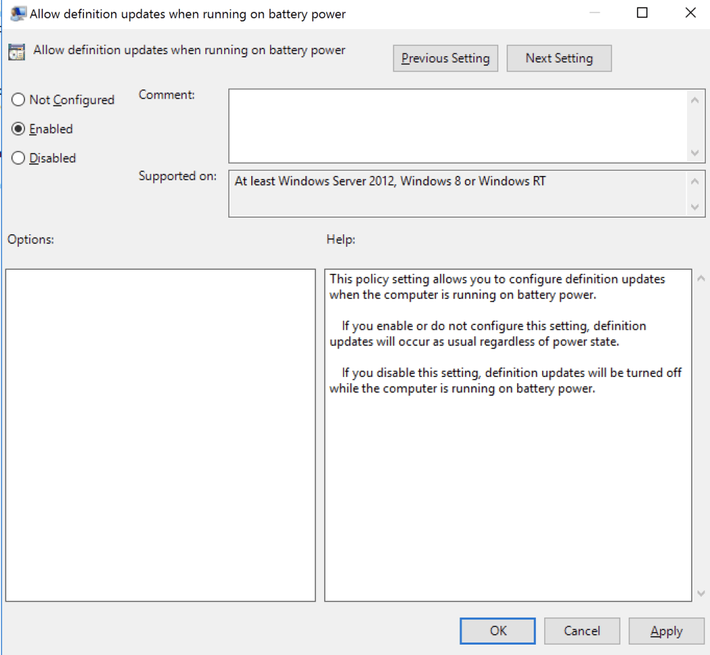 - Computer Configuration > Policies > Administrative Templates > Windows Components > Windows Defender > Turn off Windows Defender’ı Disabled yaparak Windows Defender’in son kullanıcılar tarafından kapatılmasını engelleyelim.
