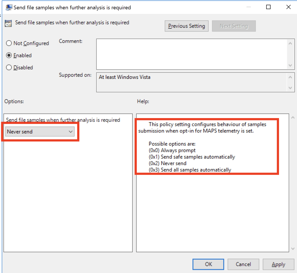 - Computer Configuration > Policies > Administrative Templates > Windows Components > Windows Defender > MAPS > Send the file samples when further analysis is required yolunu takip ederek örneklerin gönderilip gönderilmeyeceğini belirleyebilirsiniz.