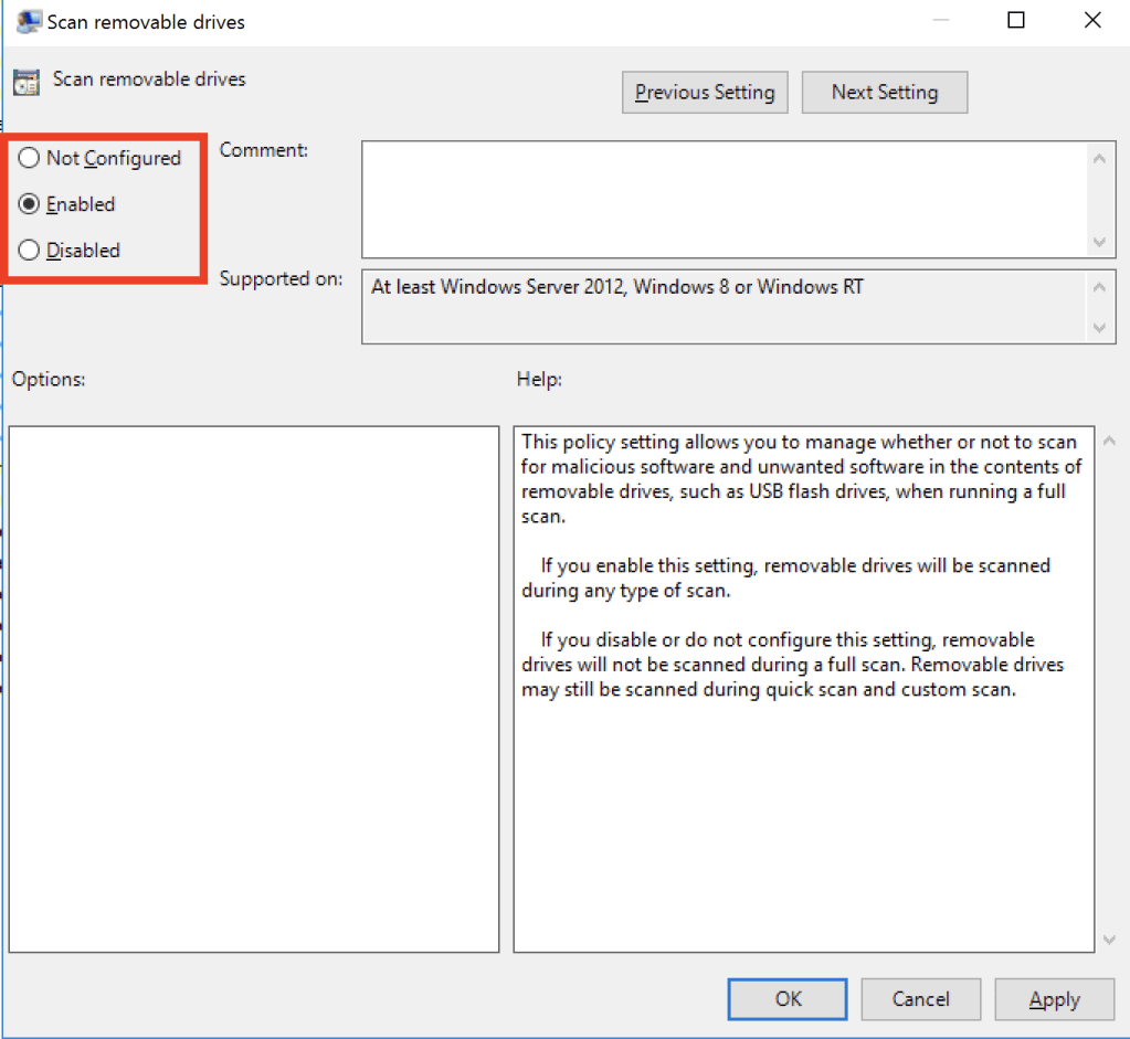- Computer Configuration > Policies > Administrative Templates > Windows Components > Windows Defender > Scan > Scan removable drives seçeneğiyle şayet full tarama başladıysa removable drivesların da taratılmasını sağlayabilirsiniz.
