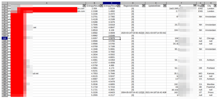 Elde ettiğimiz CSV dosyasından düşük entropi değerine sahip bir domain adının sonucu:
