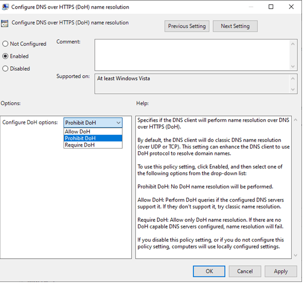 Sonuç olarak, DoH tekniğiyle oluşturulan trafiğin engellenmesi ve ilgili tekniğin kullanıldığı takdirde alarm kurallarının oluşturulması önemli. Microsoft Edge tarayıcısı için DNS over HTTPS kullanılmasını engellemek için aşağıdaki GPO ayarının yapılması mümkün. Ayrıca Google Chrome (Domain kapsamında yönetilen istemcilerde ayar kapalı olarak geliyor.) ve Firefox’da da GPO ayarlarının yapılması önem arz ediyor.