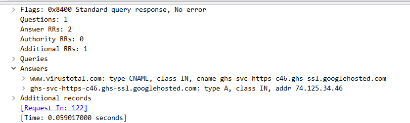 DoH ayaralı kapalı. Sonrasında VirusTotal’e standart bir DNS isteği gönderelim.