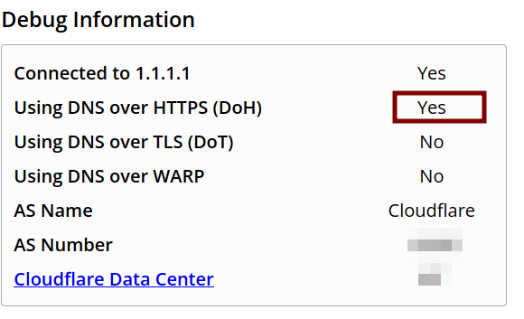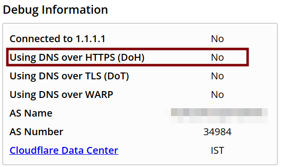 İsteklerin DNS veya HTTPS üzerinden gitmesi logların toplanması ve anlamlandırılması noktasında ne anlam ifade ediyor sorusuna cevap aramaya çalışalım. https://1.1.1.1/help adresini ziyaret ederek tarayıcıda DoH açık olup olmadığını görmeye çalışalım.