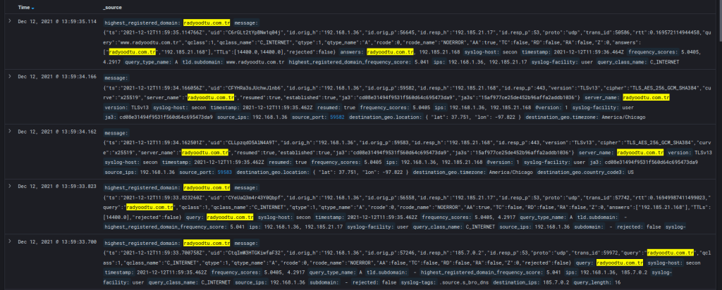 Konuyu daha iyi kavramak noktasında aşağıdaki ekran görüntüsünü incelemeye çalışalım. İsteklerin DNS protokolü (şifresiz, UDP 53) kullanarak gönderilmesi noktasında elde edilen logların SIEM’de incelenmesi gayet kolay. DNS isteklerinin DNS protokolü yerine HTTPS protokü üzerinden gönderilmesi trafiğin şifreli olması nedeniyle nispeten daha zor.