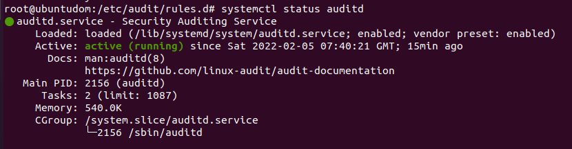 Sonrasında auditd servisinin çalışıp çalışmadığını kontrol edelim. Servis ayaktaysa şu aşamada sorun yok demektedir.