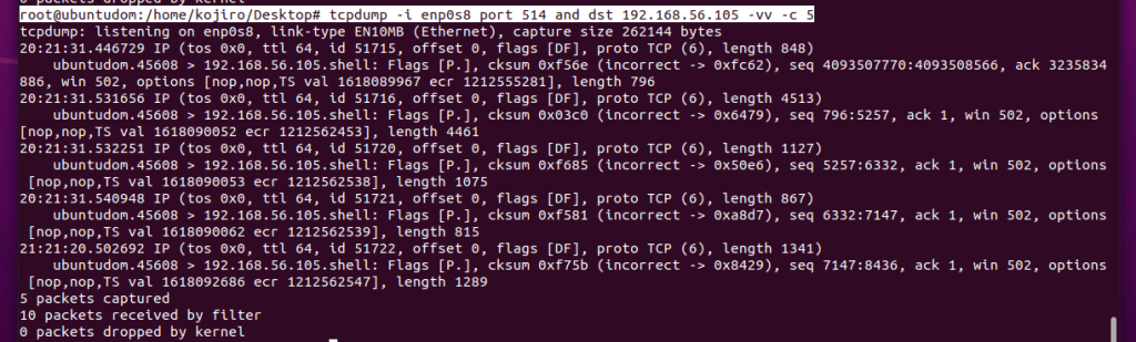 tcpdump -i enp0s8 port 514 and dst 192.168.56.105 -vv -c 5