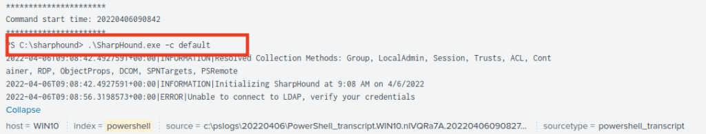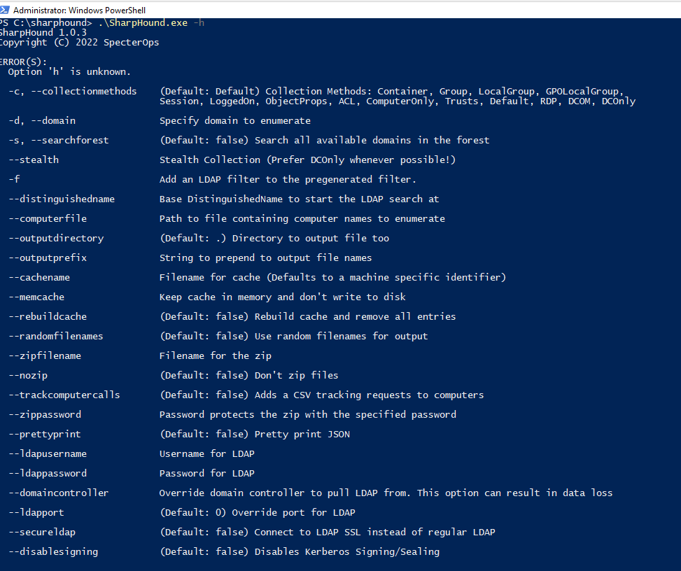 SharpHound aracının kullandığı parametleri inceleyelim. Bahse konu aracın kullandığı parametreler SIEM’de yazılacak tespit kuralları için detayları içermekte. (-c, -d, –computerfile, –zipfilename vd.)