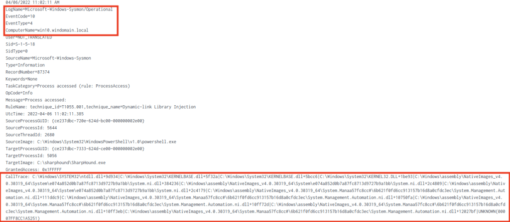Sysmon logları (EventID: 10) içinde yer alan CallTrace bölümü ve içinde yer alan dll’lere ait log: