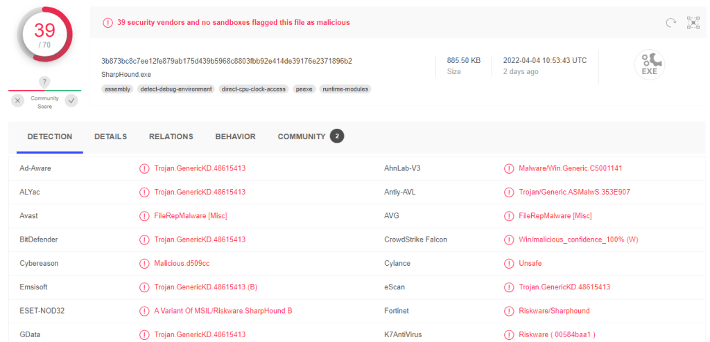 SharpHound AV’ler tarafından tespit oranı (39/70)
