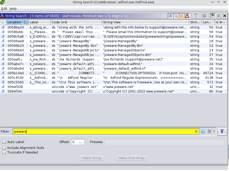 Ghidra ile ilgili exe dosyasını açtıktan sonra “joeware” stringini arattığımızda, ilgili exe dosyasının bolca “joeware” stringini kullandığını görmekteyiz. Adı geçen aracın tespiti için bu hususuda göz önünde bulunduralım.