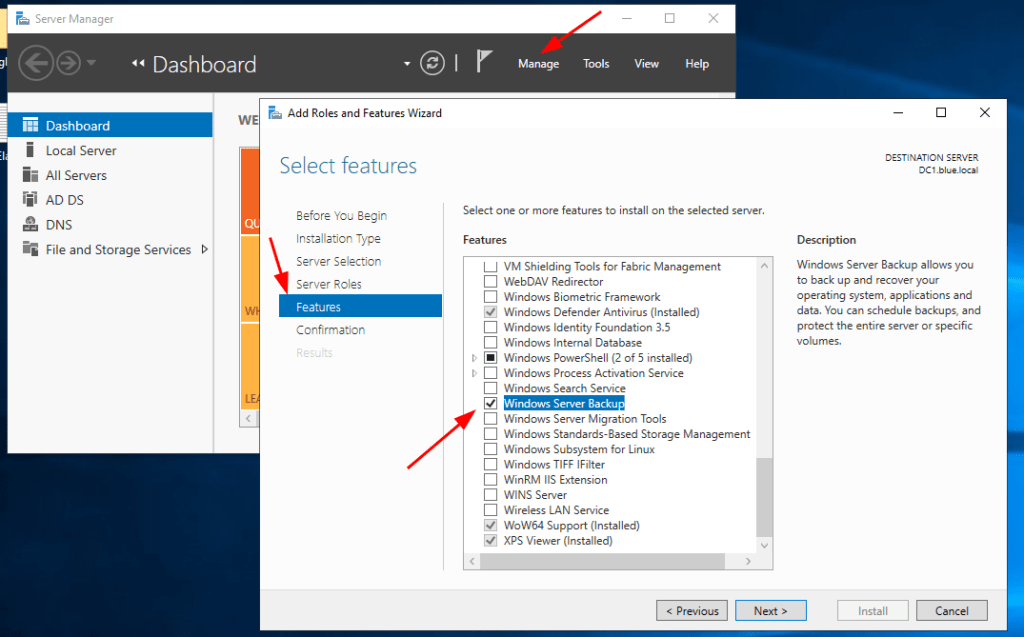 Öncelikle Windows Server Backup özelliğiyle başlayalım. Kurulum oldukça basit. “Server Manager > Add Roles and Features > Features > Windows Server Backup” yolunu takip edip “Windows Server Backup” özelliğini Domain Controller sunucusuna ekleyelim.