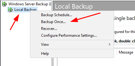 Windows Server Backup ile farklı yedekleme seçeneklerine sahibiz. Dilersek düzenli aralıklarla yedek alabilir veya tek bir yedek de alabiliriz. Öncelikle tek seferlik bir yedek alalım. “Windows Server Backup’tan şu yolu takip ederek ilk yedeğimizi oluşturmak için Local Backup > Backup Once yolunu takip edelim.