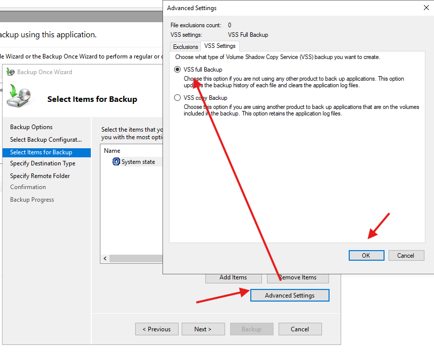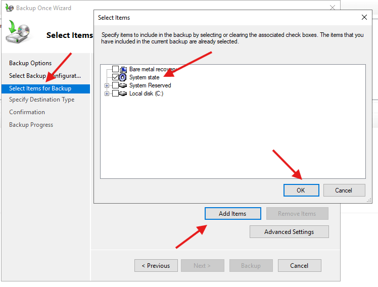 Yukarı bölümde de değindiğimiz üzere “Add Items > System state” yolunu izleyerek “System state” yedeğini alalım.