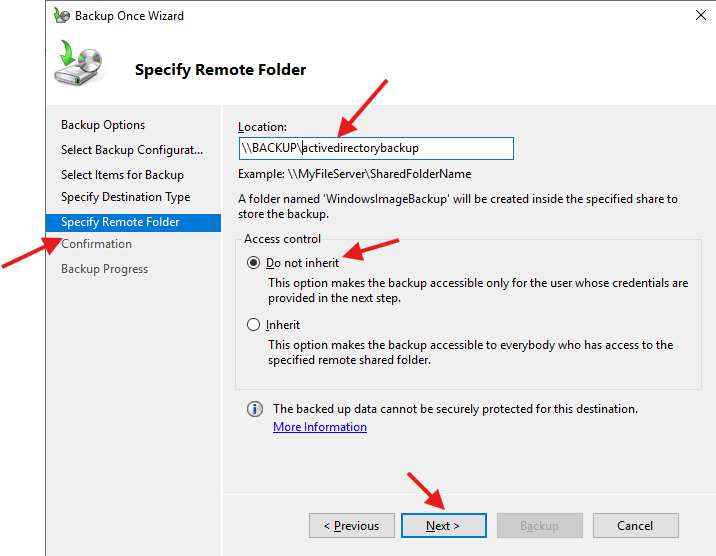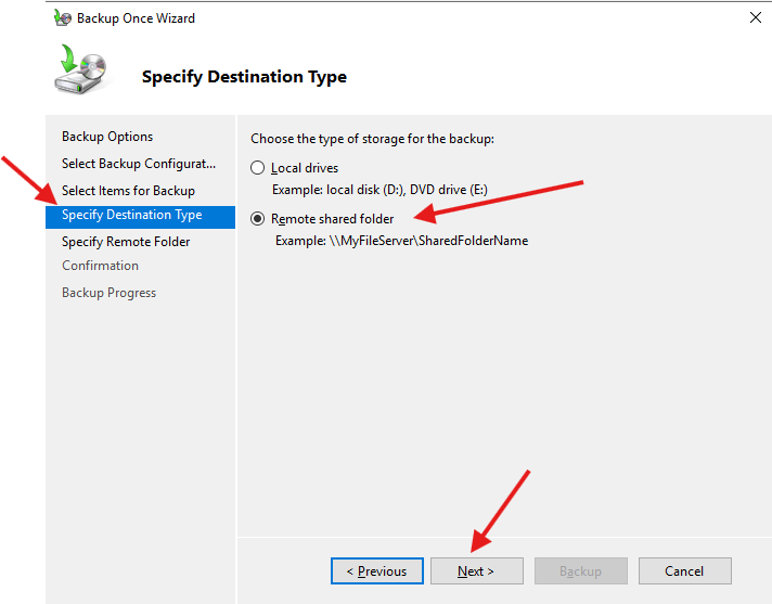 Yedeklerin farklı bir sunucuda yer alması için “Specify Destination Type > Remote shared folder” yolunu takip edelim.