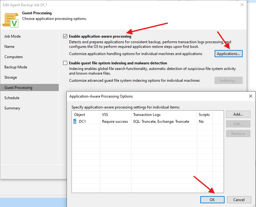 “Guest Processing” aşamasında mutlaka “Enable application-aware processing” seçeneğinin aktif olduğundan emin olalım. Application-aware backup sayesinde Domain Controller’daki Active Directory veritabanın da yedeğini almış olacağız.