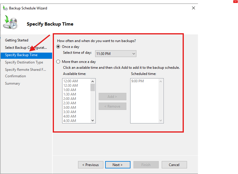 Yedeklerin düzenli aralıklarla alınmasının önemine değinmeye gerek olmadığı varsayımı altında yedeklerin alınmasının belli aralıklarla yapılması özelliği Windows Server Backup’ta mevcut.