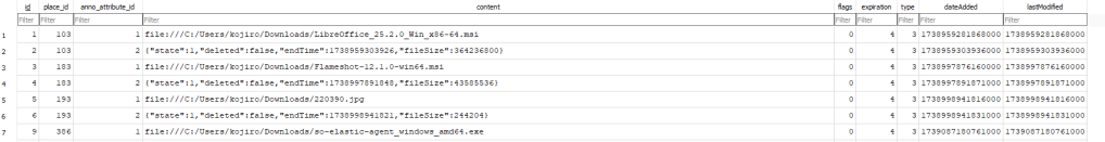 - moz_annos: Kullanıcının indirdiği dosyalar ve durumlarının tutulduğu tablo. Silme, değiştirme işlemleri buradan takip edilebilir.