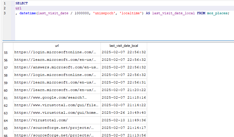 SELECT *, datetime(last_visit_date / 1000000, 'unixepoch', 'localtime') AS last_visit_date_local FROM moz_places;