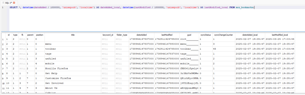 SELECT *, datetime(dateAdded / 1000000, 'unixepoch', 'localtime') AS dateAdded_local, datetime(lastModified / 1000000, 'unixepoch', 'localtime') AS lastModified_local FROM moz_bookmarks;